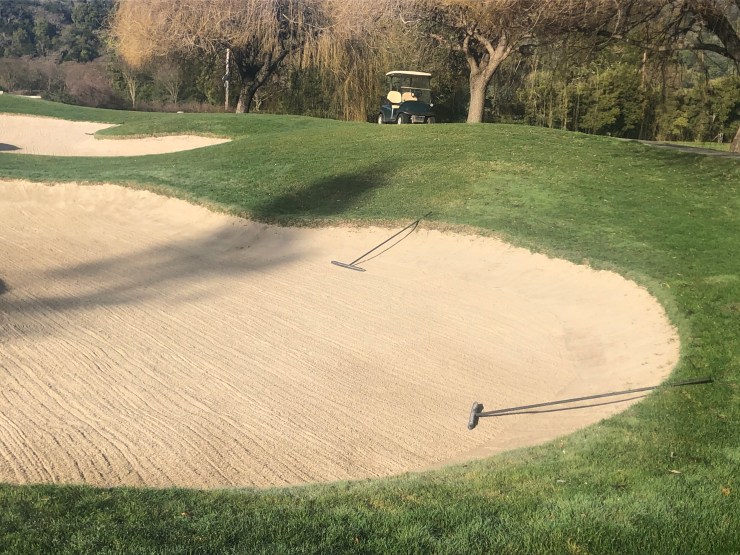 As some of you have noticed, we have started to go through the bunkers and check the sand depths. Over time, sand is moved by golfers, irrigation, rain water, wildlife (coyotes in our case) and maintenance staff, so we periodically need to go through and move the sand around along with adding or removing for playability reasons. Typically the migration of sand leads to the lower portions of the bunker, creating a scenario of too much sand in the bottom and not enough on the higher sides. As of today, we have been through the green side bunkers and starting on the fairways bunkers.