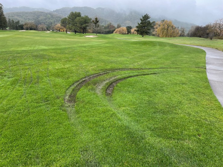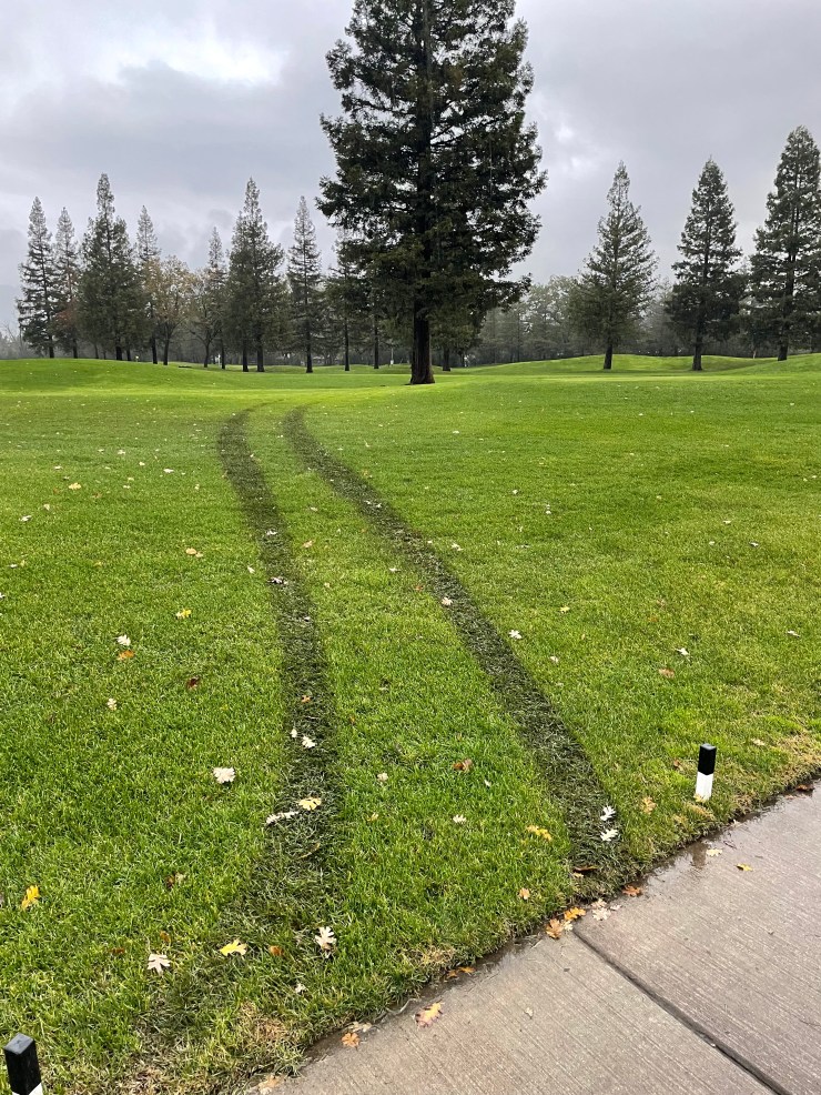 With that being said, we want to remind everyone the need to have carts on paths during certain periods this time of year. Soil Science 101 tells us soils are the most susceptible to compaction during wet periods. Compacted soils do not allow the proper air and water movement through the profile to allow viable growth. Due to the high amount of traffic on golf course playing surfaces (especially golf carts), compaction can become a serious issue inhibiting the ability to provide quality playing conditions. Along with compaction, the turfgrass is not able to recover as quickly like during the summer months due to shorter days and cooler (soil temperatures) weather. It is essential we control the use of golf cars on the playing surfaces during the winter months. We are still seeing some damage from people not following the “Cart Path Only” policy, as you can see in the photos below.