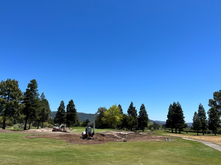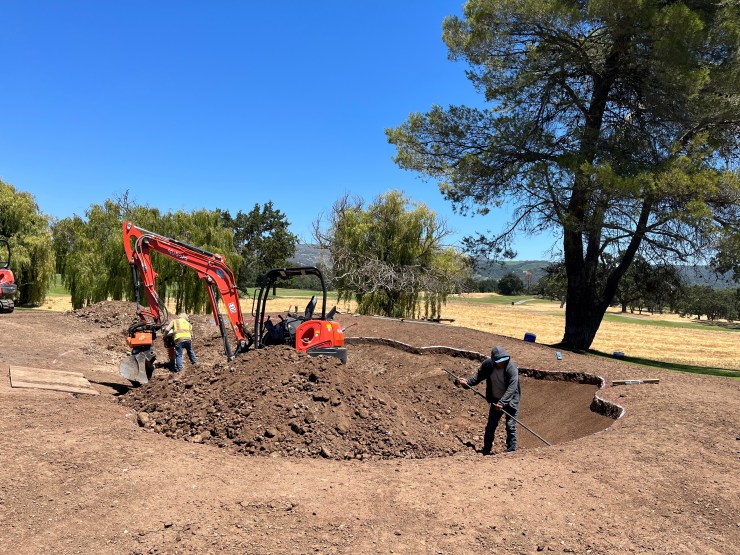This week #3 was completed with the laying of the sod on Monday. As of today, we are seeing good root growth on the sod and the beginning of root penetration into the native soil. I expect us to completely open this hole mid-week. The turf (sod) height came in higher than expected, so we will have to slowly mow down the fairway areas over time so it will not play as designed until this process is completed. We had scheduled another sod crew to come in this Saturday, but we postponed that due to the extremely hot weather that was predicted. The sod crews are scheduled for next Thursday and Friday. Currently #4 is ready for final sod and we expect #13, #14, and possibly parts of #2 to get sod at the end of the week.