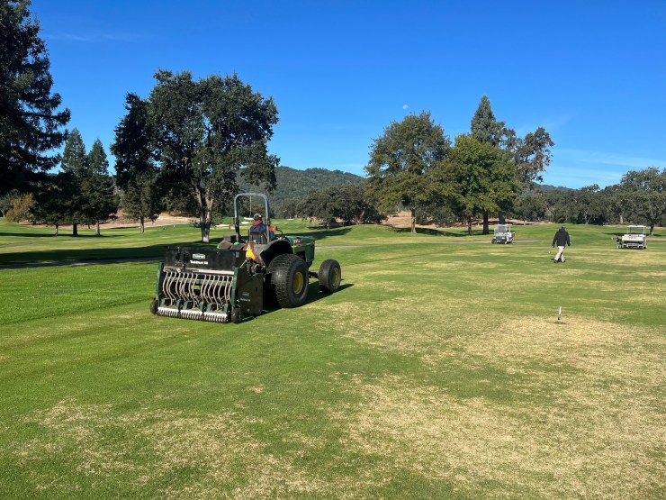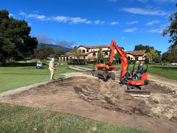 As we arrive to the second week of October, the bunker renovation project is on its final hole. The sodding of the remainder of #18 and #9 was completed this week. The only items remaining are the bunkers at #8 and the practice bunker on the driving range. We expect to complete the finish shaping 0n #8 this upcoming week and sod it on Friday. Along with that the crews will finish shape the areas in the native where soil was stockpiled during the construction phase. We will seed these areas with native material once completed. Along with the bunker project, the seeding of fairways will be completed along with fall fertilization.