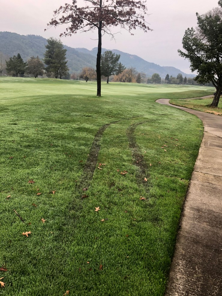 Since the rainy season is upon us, we would like to discuss the need to have carts on paths only during certain periods this time of year. Soil Science 101 tells us all soils are the most susceptible to compaction during wet periods. Compacted soils do not allow the proper air and water movement through the profile to allow viable growth. Due to the high amount of traffic on golf course playing surfaces (especially golf cars), compaction can become a serious issue inhibiting the ability to provide quality playing conditions. Along with compaction, the turfgrass is not able to recover as quickly as the summer months due to shorter days and cooler (soil temperatures) weather. It is essential we control the use of golf cars on the playing surfaces during the winter months.